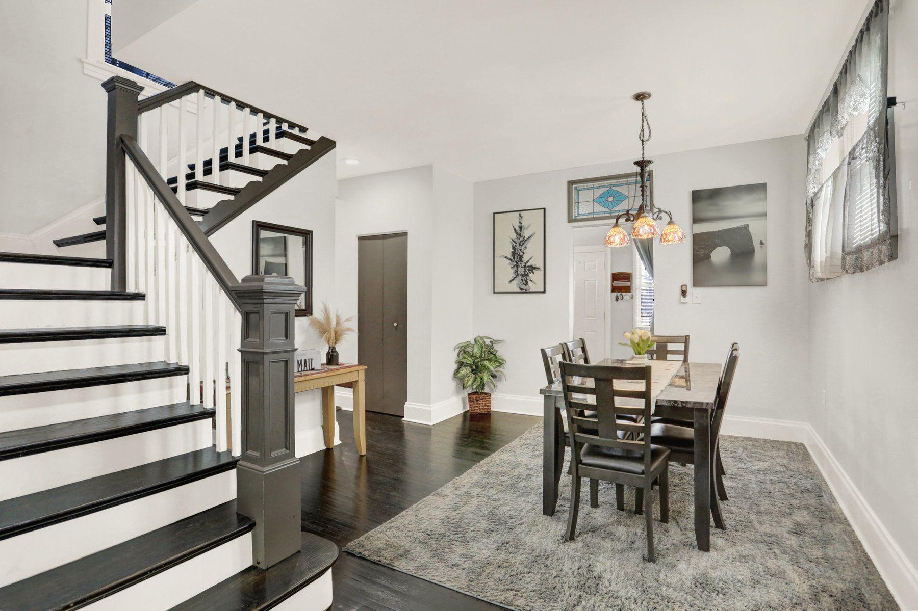 The main floor features restored original hardwood flooring, neutral color tones, and a beautifully restored staircase that highlights the home’s historic roots. The kitchen is both stylish and functional, featuring luxury vinyl plank flooring, a custom backsplash, stainless steel appliances, abundant cabinet storage, generous counter space, and stunning pendant lighting across the island. A large eat-in area makes this space perfect for everyday living and entertaining.